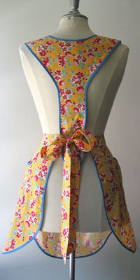 Eunice has a clever innovation we spied on a beautiful vintage flea market find. A single piece runs down the back to the waist. Simply thread the apron strings through one of three channels sewn into the back piece and tie a bow. The result? A flattering apron with three height adjustments, that fits an endless amount of “widths”.